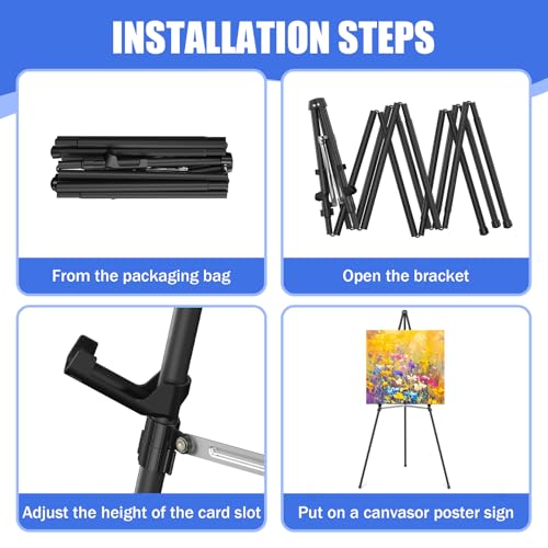【Easy to Use】 With its convenient design, setting up and adjusting the picture easels for display is a breeze. Simply unfold the legs, adjust the height to your desired level, and lock easels for painting in place. This process ensures that you can quickly set up your display and focus on promoting your products or services.