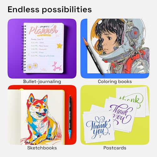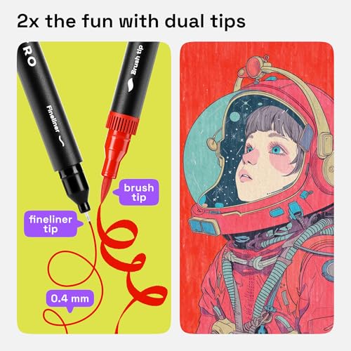 BRUSH & FINE POINT PENS: Explore endless opportunities with these dual-ended drawing pens. You get 2-in-1 art pens that are both 0.4 mm fine tip pens and dual brush marker pens. These coloring markers are perfect for doodling, coloring, writing, and coloring books.