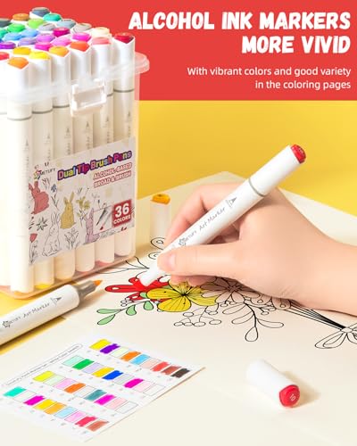 Simetufy 36 Colors Alcohol Markers Brush Tip, Coloring Markers for Adult Coloring Books, Dual Tip Alcohol Markers Brush Tip and Chisel Tip for Coloring, Drawing