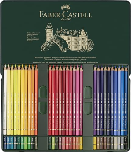 Faber Castel-Polychromous Colored Pencil Set In Metal Tin. Color pencils can be laid down with delicate or strong strokes to unfold their vibrant colors. The leads are bonded to prevent breakage. They can be perfectly combined with graphite pencils. This package contains sixty 3.8mm colored pencils in a wide range of colors within one 7-1/4×12-5/8×7/8 inch tin case. Conforms to ASTM D 4236. Acid free. Imported.