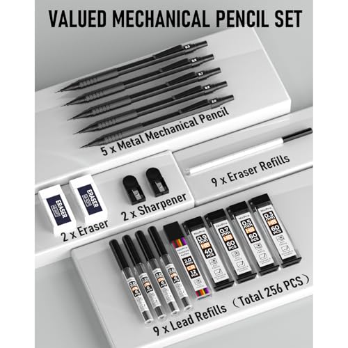 Value Mechanical Pencils Set: The drafting pencil set come with 5 pcs metal mechanical pencils in 5 sizes: 0.3, 0.5, 0.7, 0.9 and 2.0mm, 4 tubes 0.3/0.5/0.7/0.9mm HB lead refill (60 pcs/tube), 5 tubes 2.0mm refills (4B, 2H, HB, 2B, 12 Colors), 2 pcs erasers, 9 pcs eraser refills, 2 pcs lead sharpener, a plastic pencil case