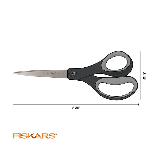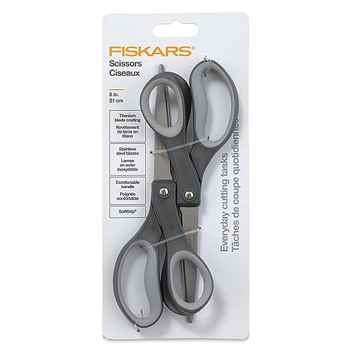 Experience reliable comfort for all-purpose cutting around the home and office with Fiskars® Everyday Titanium Scissors with SoftGrip®. Stainless steel blades feature titanium blade coating that is 3x harder than steel for added durability. Ergonomic SoftGrip® handle provides excellent comfort and control. Package contains two, 8-inch scissors.